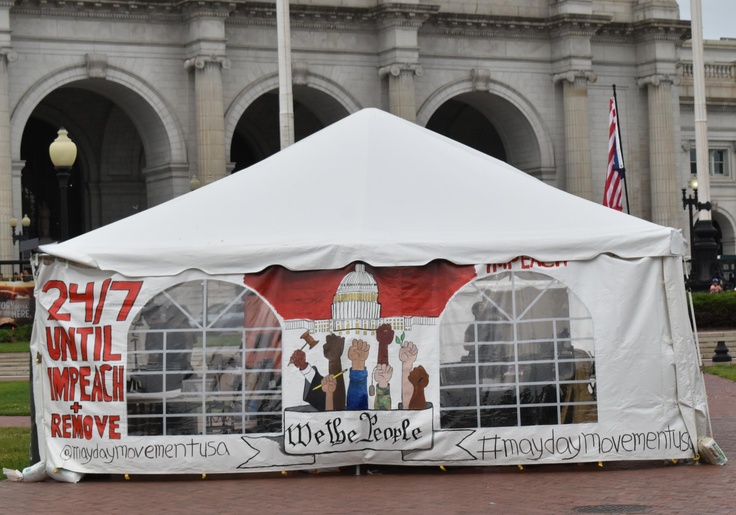 Adams and other activists founded the group in an effort to force the impeachment of President Donald Trump. Since then, the group has hosted speakers like Rep. Eric Swalwell (D., Calif.) at its Union Station encampment and has expanded its footprint to include disruptive “direct action” protests at White House budget director Russell Vought’s home, Secretary of War Pete Hegseth’s church, Fox News, and the Heritage Foundation. The group’s protests mainly involve activists screaming obscenities and making loud noises.