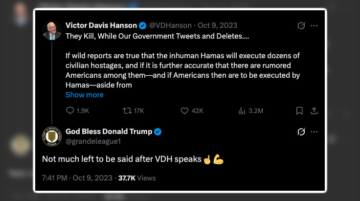 Among the posts Mrs. Goldman liked was a widely circulated meme from the popular account @EndWokeness mocking the slogan “Jews for Palestine” as “Chickens for KFC.” She also liked posts suggesting that Western activists who chant “Free Palestine” might consider relocating to Gaza and living under Hamas rule. Another post came from the account “God Bless Donald Trump,” which praised Hoover Institution fellow Victor Davis Hanson for arguing that the United States should revoke visas for visitors from places such as Iran and the Palestinian territories if Hamas executed American hostages.