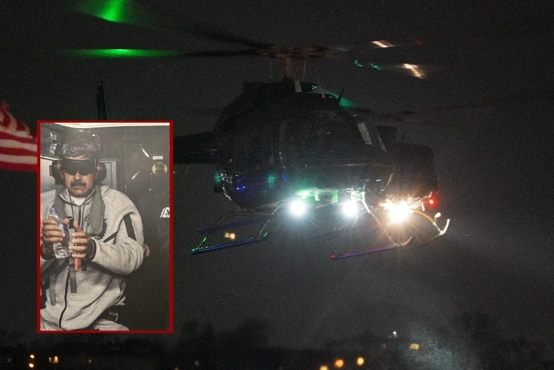 (Background) A helicopter carrying Venezuelan leader Nicolas Maduro arrives in Manhattan on January 03, 2026 in New York City. (Ryan Murphy/Getty Images) / (L) Image of captured Venezuela leader Nicolas Maduro via President Donald Trump on Truth Social