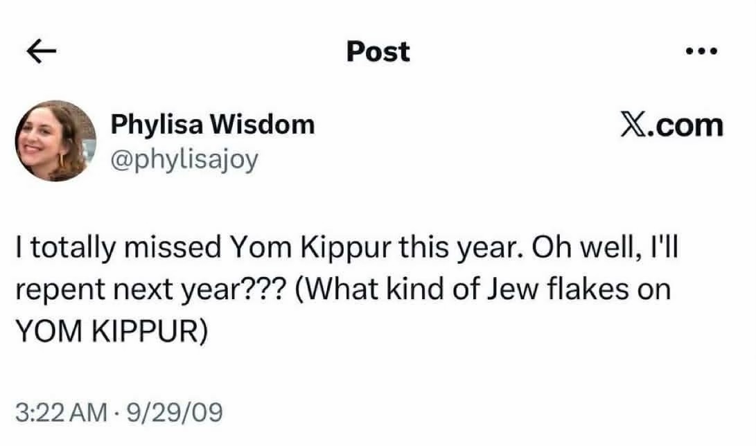 Wisdom once posted about how she “totally missed Yom Kippur,” asking, “What kind of Jew flakes on YOM KIPPUR[?]”