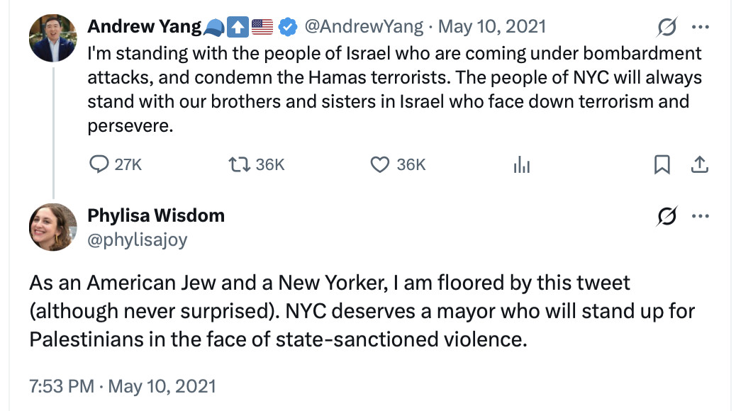 “As an American Jew and a New Yorker, I am floored by this tweet (although never surprised),” she wrote. “NYC deserves a mayor who will stand up for Palestinians in the face of state-sanctioned violence.”