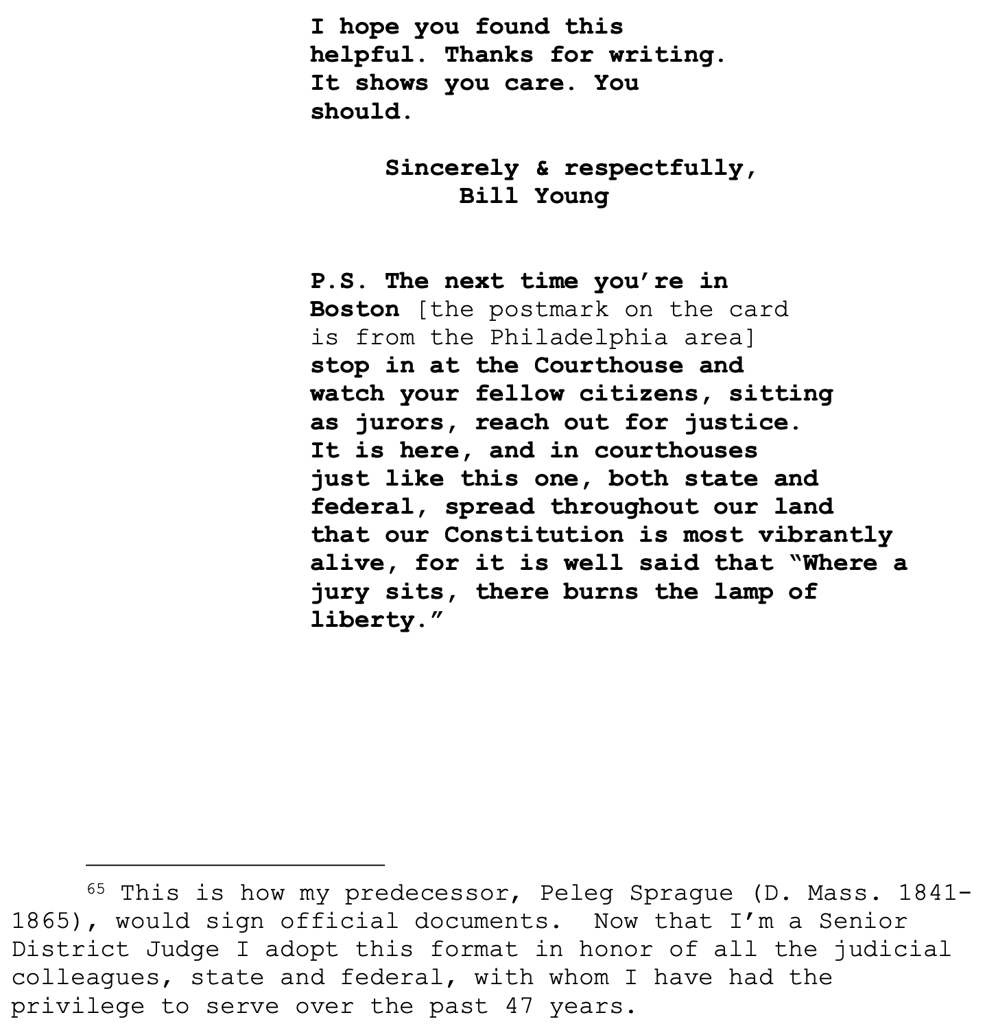 “P.S. The next time you’re in Boston [the postmark on the card is from the Philadelphia area] stop in at the Courthouse and watch your fellow citizens, sitting as jurors, reach out for justice,” Young wrote. “It is here, and in courthouses just like this one, both state and federal, spread throughout our land that our Constitution is most vibrantly alive, for it is well said that ‘Where a jury sits, there burns the lamp of liberty.’”