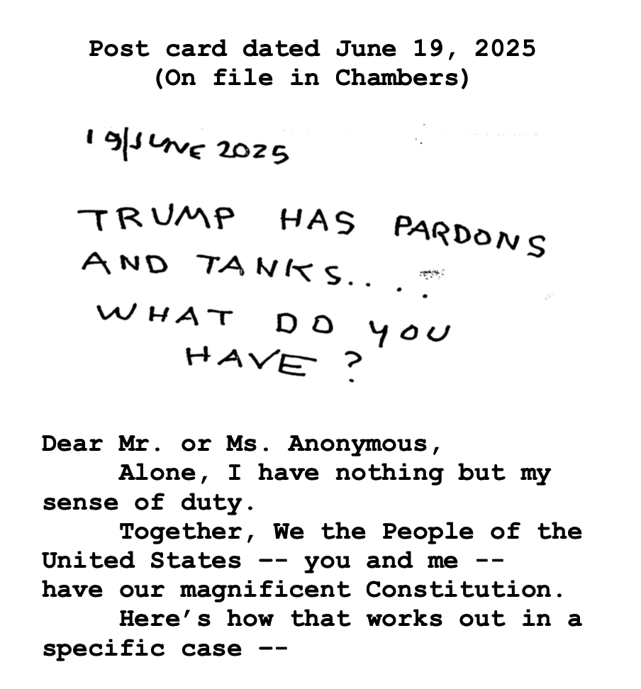 The handwritten, all-caps postcard, dated June 19, read: “TRUMP HAS PARDONS AND TANKS….WHAT DO YOU HAVE?” Young included a copy in the ruling.