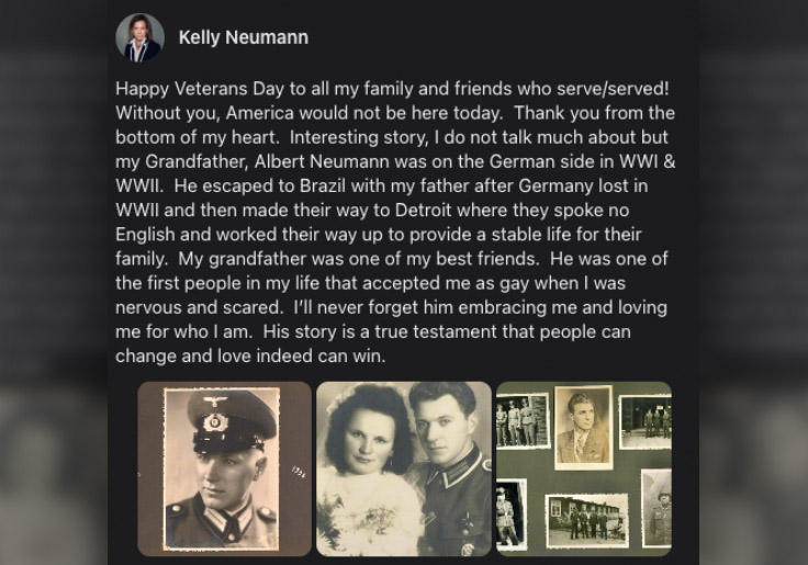 The Facebook post from Nov. 11, 2024, which hasn’t been deleted, must be seen to be believed. After wishing a happy Veterans Day to her friends and family members who served in the U.S. military, Neumann relayed the “interesting story” of her grandfather, Albert Neumann, who also served in combat “on the German side in WWI & WWII.” The post included several photos of Neumann’s beloved “Opa” posing in what appears to be a Nazi officer’s uniform.