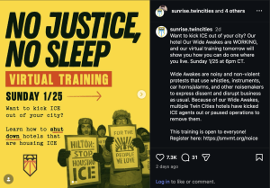 “Our strategy to target hotels that are housing ICE agents is WORKING,” Sunrise posted to Instagram on Jan. 19. “Two hotels in the Twin Cities just decided to pause their operations rather than house ICE agents. We need other hotels to follow their lead … We the people have the power, and we’re not backing down.”