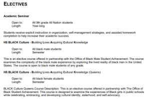 One of the proscribed courses, “BLACK Culture – Building Lives Acquiring Cultural Knowledge,” is open only to black men. Another, “BLACK Culture – Building Lives Acquiring Cultural Knowledge (Queens),” is open only to black women, a practice civil rights attorneys say almost certainly puts the schools in violation of civil rights law.