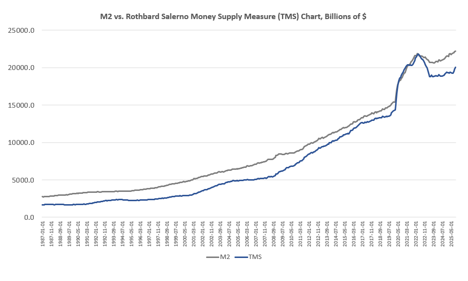 The money supply metric used here—the “true,” or Rothbard-Salerno, money supply measure (TMS)—is the metric developed by Murray Rothbard and Joseph Salerno, and is designed to provide a better measure of money supply fluctuations than M2. (The Mises Institute now offers regular updates on this metric and its growth.)