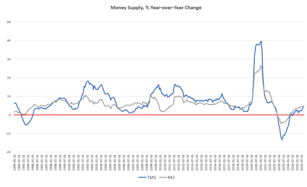 Historically, M2 growth rates have often followed a similar course to TMS growth rates, but M2 has even outpaced TMS growth in eleven of the last twelve months. In October, the M2 growth rate, year over year, was 4.63 percent. That’s up from September’s growth rate of 4.47 percent. October’s growth rate was also up from October 2024’s rate of 2.97 percent.