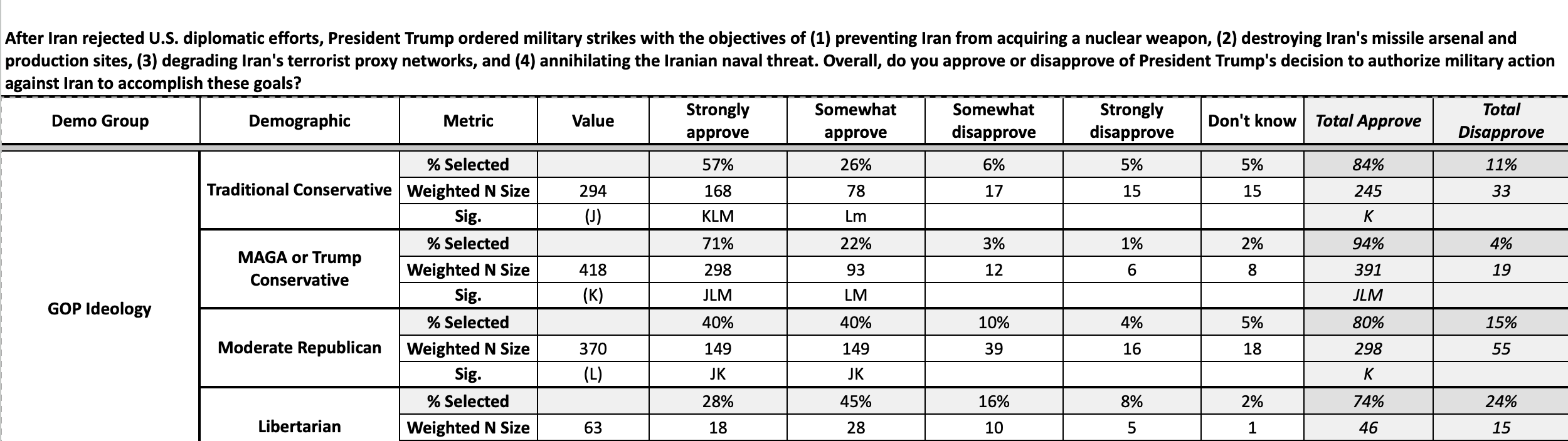 Overall, 84 percent of the Trump voters surveyed said they approve of the military campaign against the Iranian regime, while just 14 percent disapprove.
