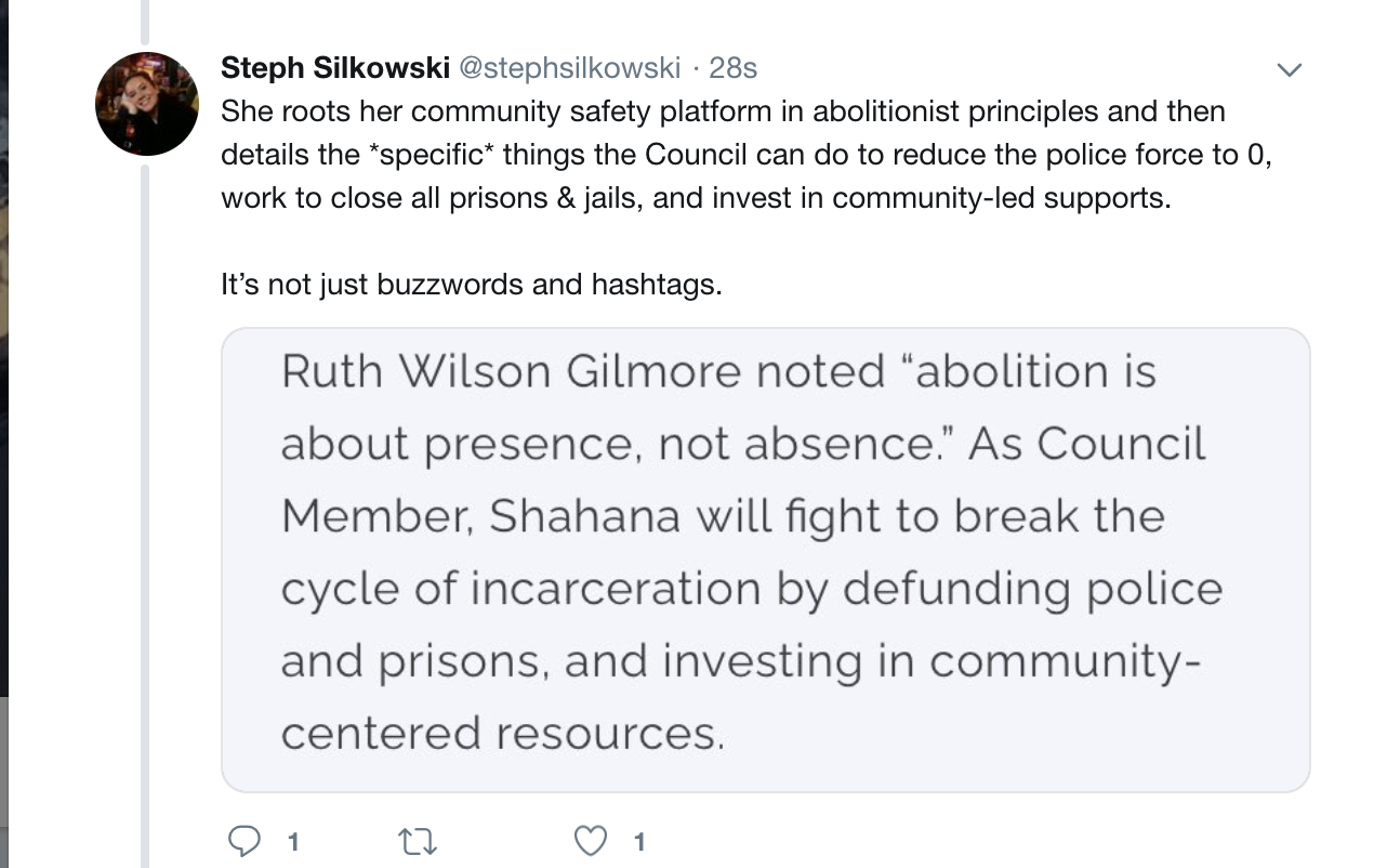 “She roots her community safety platform in abolitionist principles and then details the *specific* things the Council can do to reduce the police force to 0, work to close all prisons & jails, and invest in community-led supports,” Silkowski posted.