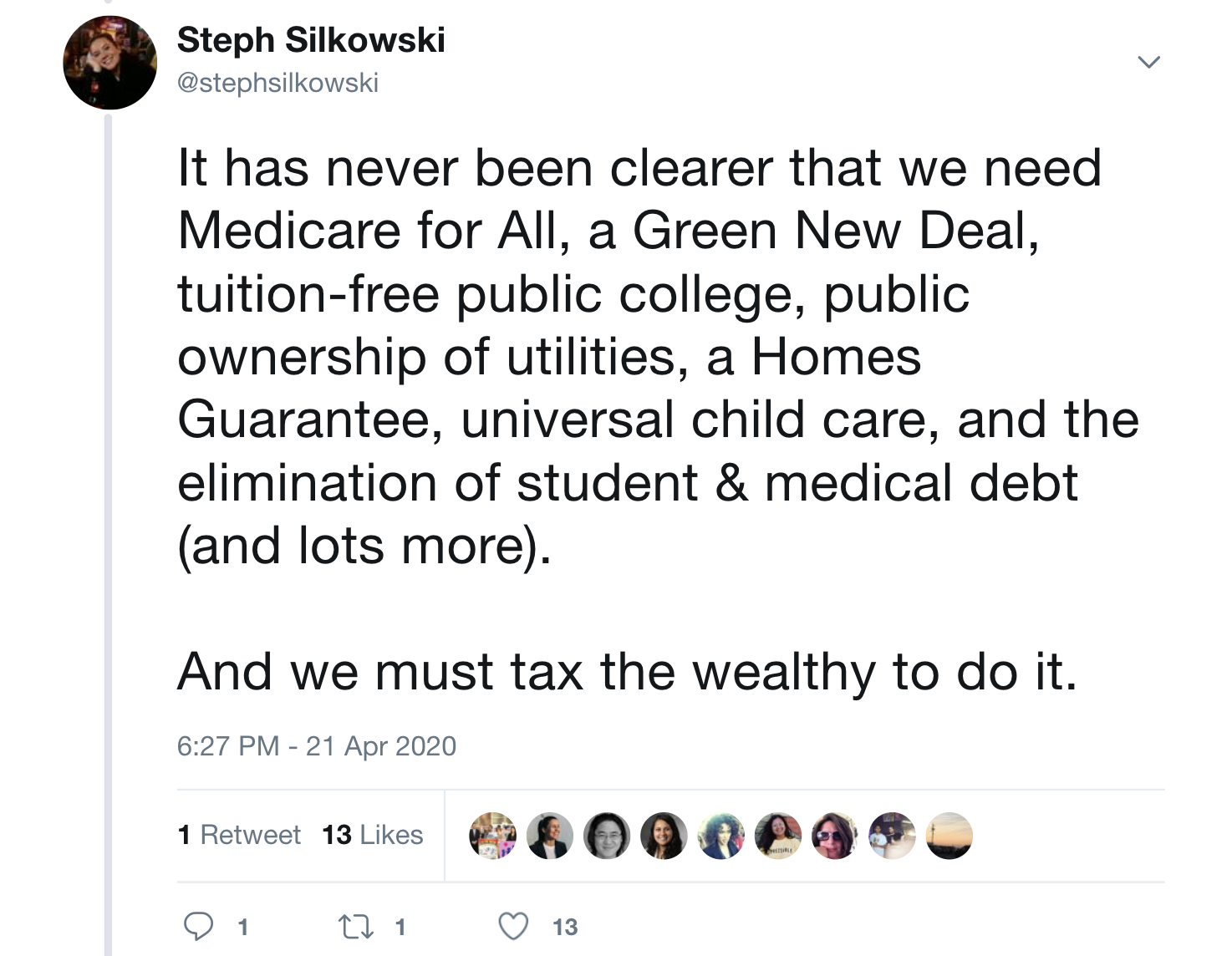 “It has never been clearer that we need Medicare for All, a Green New Deal, tuition-free public college, public ownership of utilities, a Homes Guarantee, universal child care, and the elimination of student & medical debt (and lots more),” she wrote in April 2020. “And we must tax the wealthy to do it.”