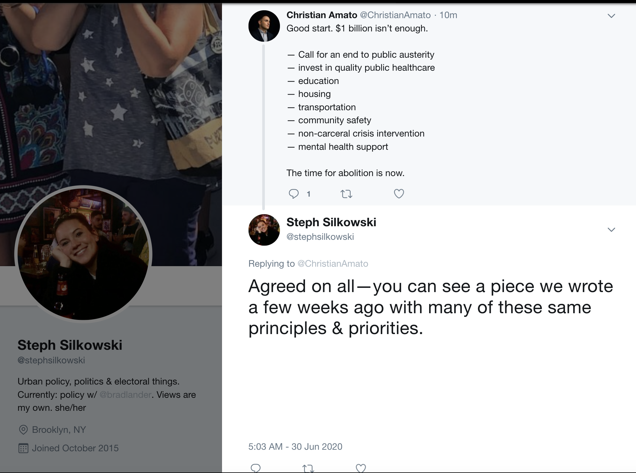 Ahead of the 2021 City Council elections, Silkowski wrote favorably of then-candidate Shahana Hanif (D.) and her plans for “defunding police” and “abolition.”