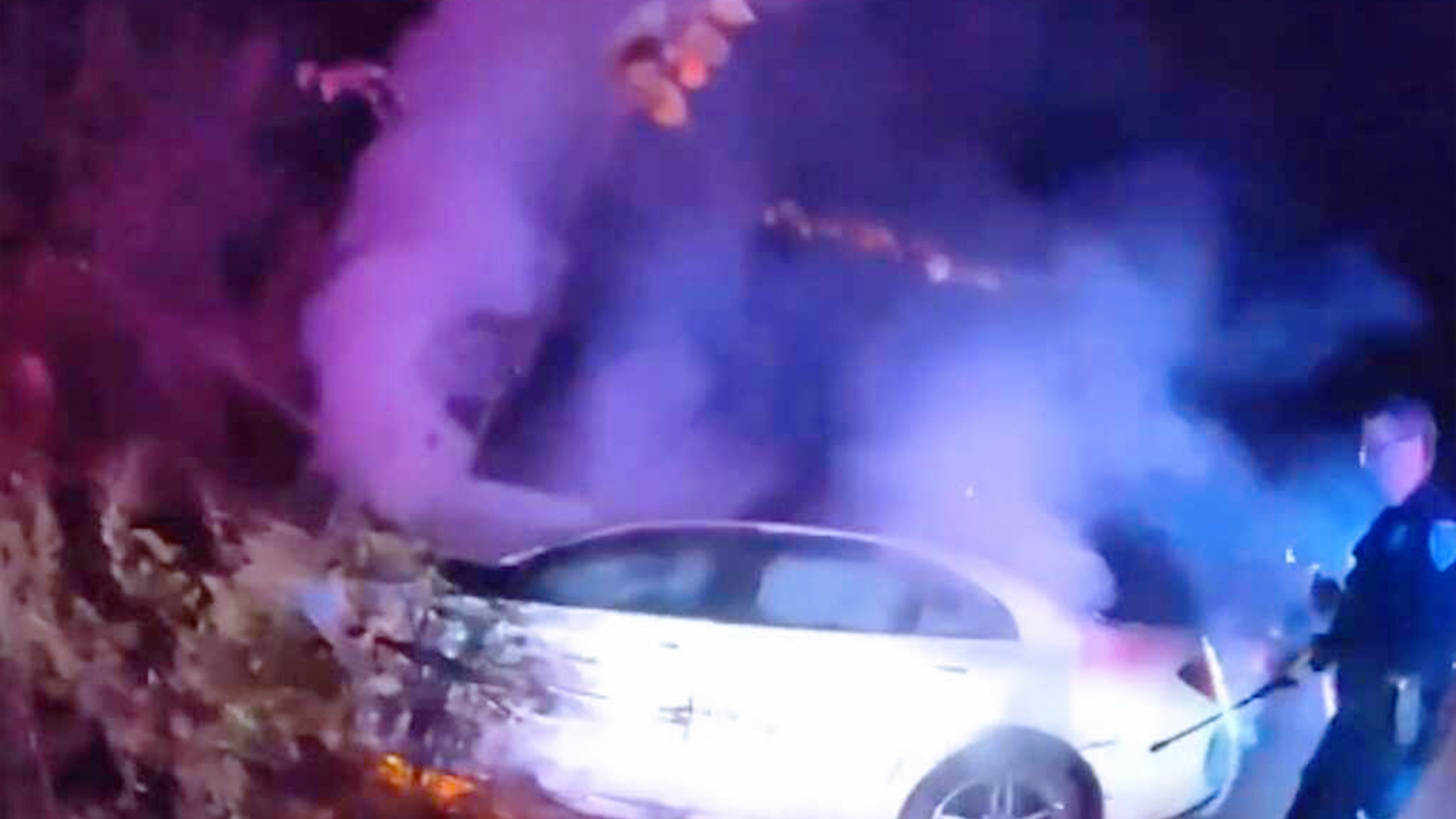 Dashcam and bodycam video captured the moment police approached a burning car on Nov. 9, just before it was totally enveloped in flames.