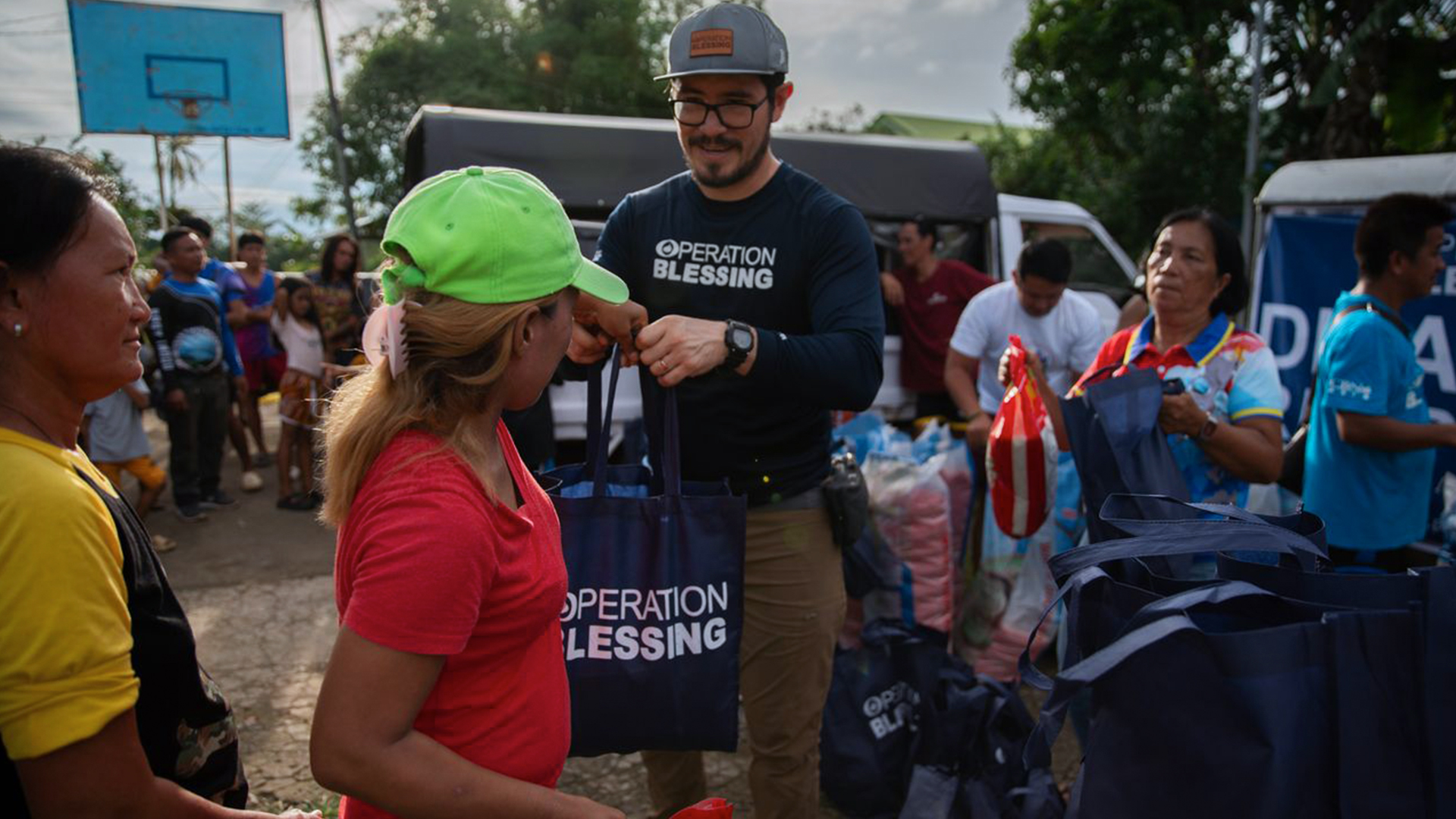 A separate Operation Blessing disaster relief team reached Clarita’s community, delivering food bags and hygiene kits to affected families.