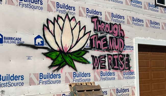 Last month, the 10th family was ready to move back in. Renovations are still going on. One homeowner tagged the home wrap on his house’s unclad exterior with “Through the mud we rise.” Many houses being rebuilt have signs out front, proclaiming the different sponsors caring for the family, or a volunteer group like the Mennonites helping to rebuild.