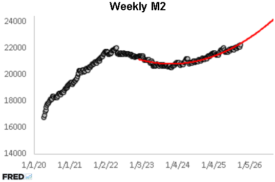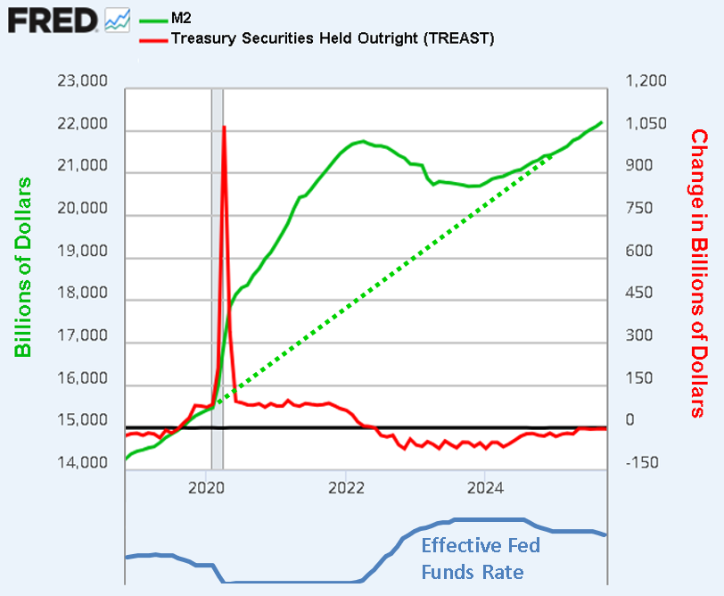 Since late 2022, M2 (black dots) has followed a remarkably stable quadratic trend (red curve). This path began midway through the Fed’s aggressive tightening cycle, triggered by inflation topping 9 percent and producing the first sustained M2 decline since the 1930s. Even though the Fed has been a net seller of securities since then, M2 growth turned positive in early 2023 and has accelerated along that red curve. It is now running near 5 percent year over year and could reach 9 percent by late 2026 if the curve holds. Against this backdrop, claims from President Trump, his allies, and Wall Street that the Fed is “too tight” reveal a deep misunderstanding of how monetary policy operates under the new banking framework.