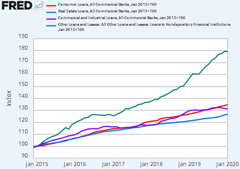 The next chart shows this effect intensifying in late 2024. Loans to NDFIs surged 48 percent in just ten months, while real estate lending rose only 1.4 percent and consumer and C&I loans actually declined by 3.1 percent and 2.6 percent, respectively.