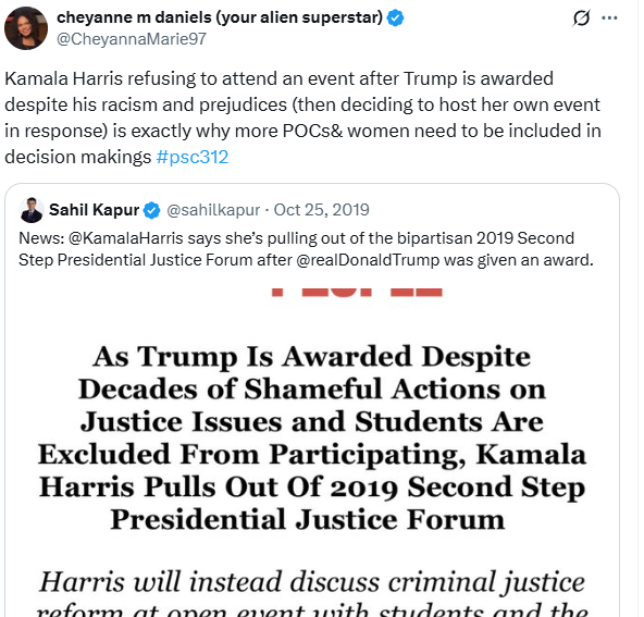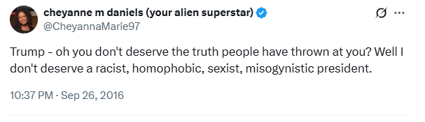 In June, Daniels penned a piece headlined, “Black churches push back against Trump-fueled anti-DEI wave,” which quoted from the notorious anti-Semite Al Sharpton. Daniels has not criticized Sharpton for his role in inciting the 1991 Crown Heights riots but has described Trump as a “racist, homophobic, sexist, misogynistic president.” She has also lauded Kamala Harris for “refusing to attend” a bipartisan event that honored Trump, saying the move “is exactly why more POCs& women need to be included in decision makings.” Two weeks after Biden’s election, she referred to Trump supporters as “Magatts.”