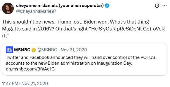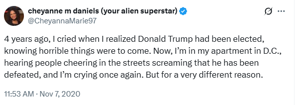 Her reporting is now largely focused on the White House, the subject of several of her posts on social media. On Nov. 7, 2020, the day the Associated Press called the presidential election for Joe Biden, Daniels tweeted: “4 years ago, I cried when I realized Donald Trump had been elected, knowing horrible things were to come. Now, I’m in my apartment in D.C., hearing people cheering in the streets screaming that he has been defeated, and I’m crying once again. But for a very different reason.”