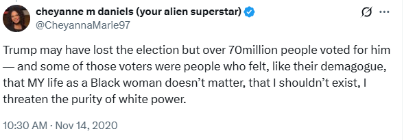 One week later, Daniels’s euphoria seemed to fade. “Trump may have lost the election,” she wrote, “but over 70 million people voted for him — and some of those voters were people who felt, like their demagogue, that MY life as a Black woman doesn’t matter, that I shouldn’t exist, I threaten the purity of white power.”