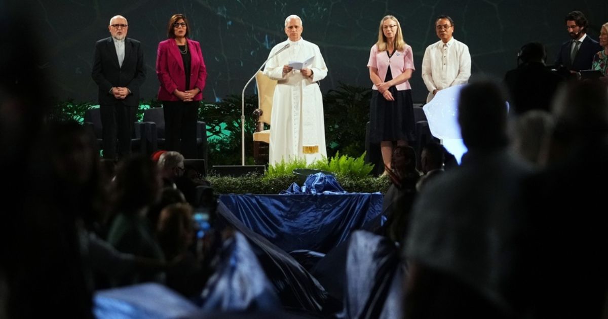 NEW: Pope Leo XIV blesses a block of ice before a blue tarp is rolled out and waved by people, including Arnold Schwarzenegger, at the Raising Hope for Climate Justice conference.