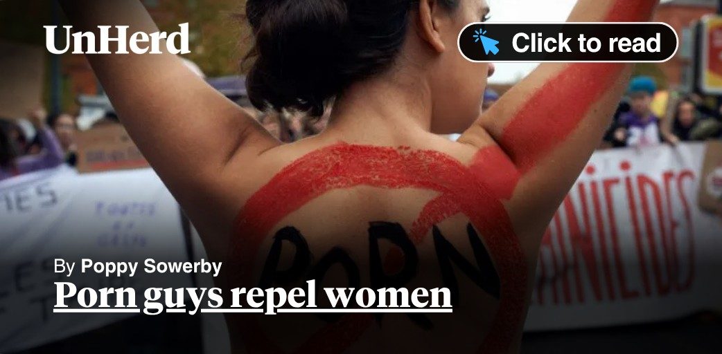 That pornography is a growing social ill is somehow still controversial, but anyone who reads Jo Bartosch and Robert Jessel’s new compendium of horror Pornocracy cannot fail to be convinced. In it, one interviewee remarks how “extraordinary” it is that “women are expected to love, sexually service and live with men who are excited by images of their degradation and violation”. The book proposes that straight women would do better to “swear off men” rather than put up, shut up and put out. It also tells us that married men who started watching porn during their marriage doubled their chances of divorce — and that, in the words of one “porn widow”, the habit is “a staggering waste of connection, a waste of humanity”. Feminists have long been blamed for the so-called male loneliness epidemic; in light of the horrifying escalation in the volume and extremity of porn the men we’re supposed to save from loneliness are gobbling up, it might well be time for a name change. The “male consequences epidemic”, perhaps?