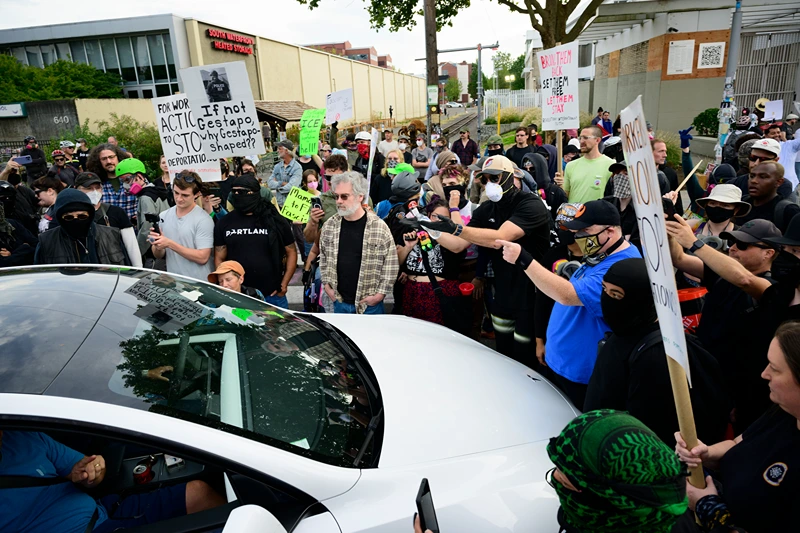 PORTLAND, OREGON - SEPTEMBER 28: Protesters engage a vehicle that drove into the crowd outside of the U.S. Immigration and Customs Enforcement building on September 28, 2025 in Portland, Oregon. In a Truth Social post on September 27th, President Trump authorized the deployment of military troops to "protect War ravaged Portland, and any of our ICE Facilities under siege from attack by Antifa, and other domestic terrorists." (Photo by Mathieu Lewis-Rolland/Getty Images)