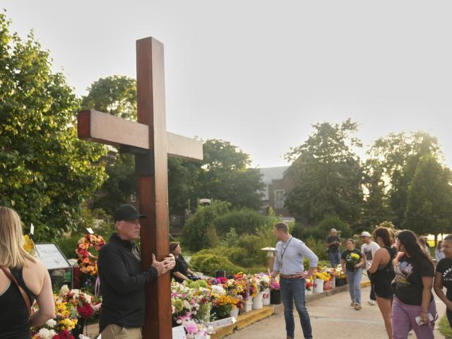 Dan Beazley carries a cross at a memorial at Annunciation Catholic Church after a school chapel shooting, Aug. 28, 2025, in Minneapolis. (AP Photo/Abbie Parr)