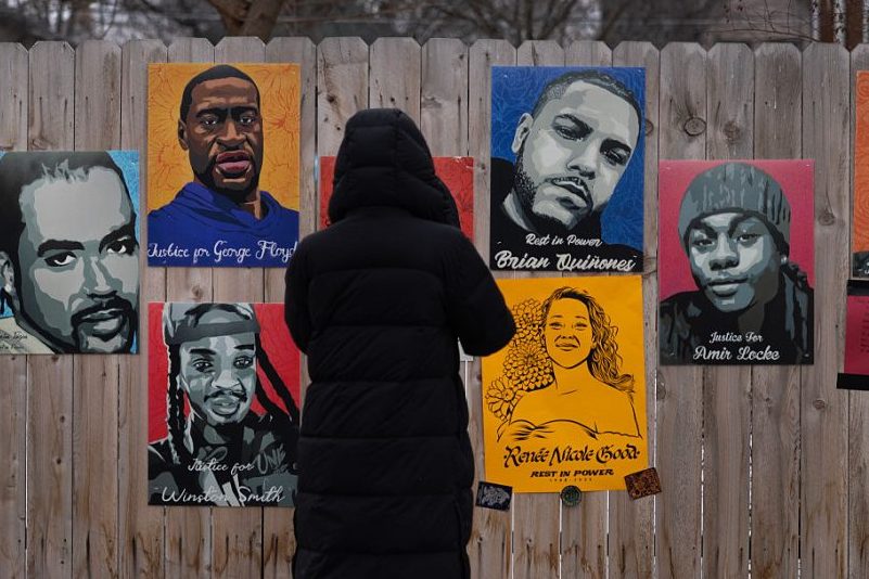 A poster featuring the likeness of Renee Good hangs alongside pictures of others, including George Floyd, near a memorial to Good on January 15, 202,6 in Minneapolis, Minnesota. (Photo by Scott Olson/Getty Images)