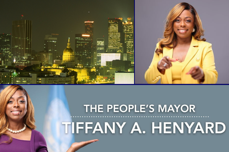 (L) Nightime view of the skyline of Atlanta, Georgia. Mandatory Credit: Simon Bruty/Allsport / (R) official Tiffany Henyard mayoral X profile pic. (Photo via: X screenshot) / (Bottom) Official Tiffany Henyard mayoral banner (Photo via: X screenshot)