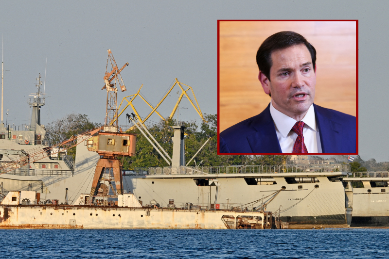 (R) US Secretary of State Marco Rubio. (Photo by Jonathan Ernst / POOL / AFP via Getty Images)/ (Background) Cuban coast guard ships docked at the port of Havana on February 25, 2026. Cuba’s coast guard said on February 25, 2026, it shot dead four people and wounded six others. (Photo by Adalberto ROQUE / AFP via Getty Images)