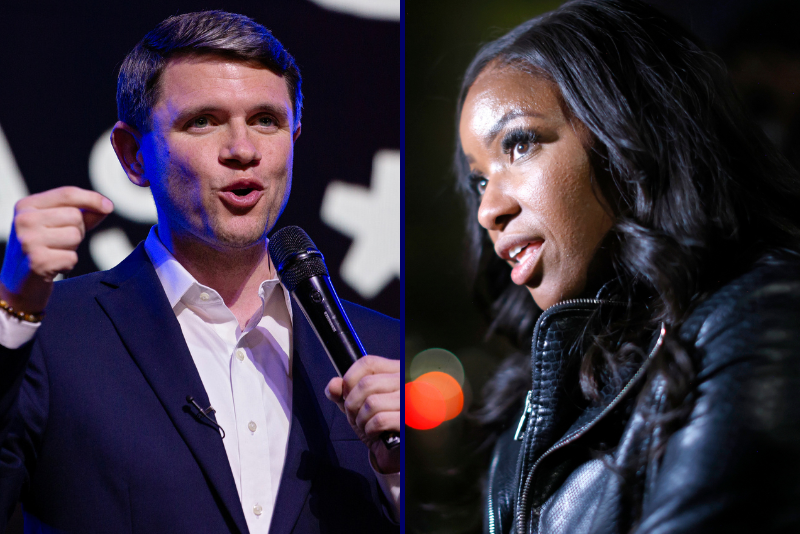 (L) Texas Senate candidate James Talarico (D-TX). (Photo by Danielle Villasana/Getty Images) / (R) Rep. Jasmine Crockett (D-TX). (Photo by Ron Jenkins/Getty Images)