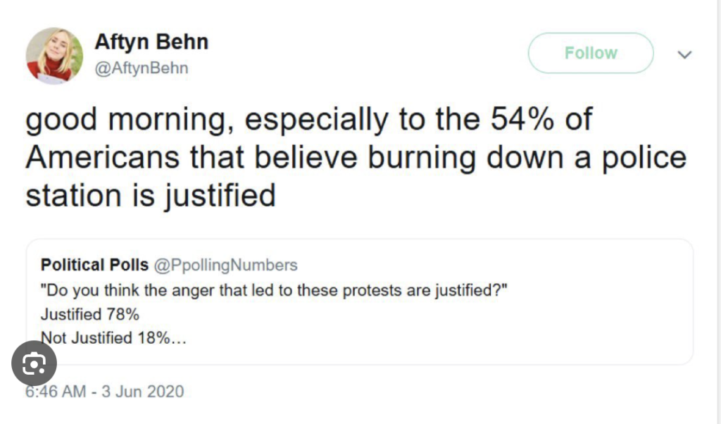 She also asserted during the 2020 Black Lives Matter riots that “burning down a police station is justified.”