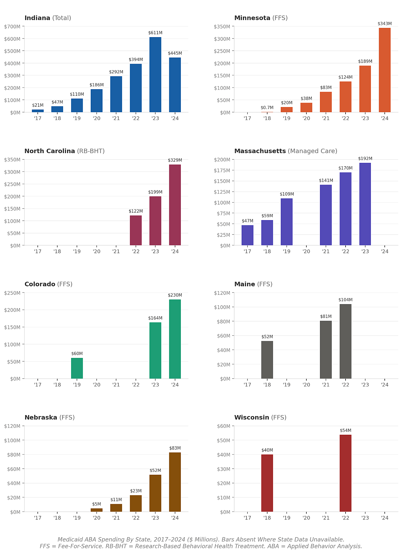 Across the eight states with publicly available ABA data included in this report—Indiana, Minnesota, Colorado, Massachusetts, Nebraska, North Carolina, Wisconsin, and Maine— Medicaid spending on autism therapy grew from a combined $347 million to over $2.2 billion in recent years, a 561 percent increase.
