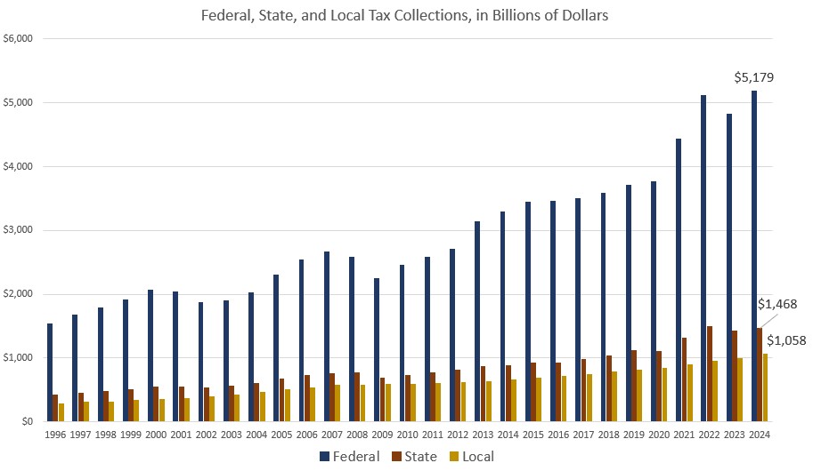 Nor is this significantly changed if we add in local taxes. As we noted above, in 2024, taxpayers paid more than $5.1 trillion to the federal government and about $1.47 trillion to the state governments. Local governments, on the other hand, collected $1.1 trillion during that same period. State and local tax revenue combined, therefore, amounts to about $2.5 trillion. That’s less than half of federal tax collections. Only during periods of recession or weak economic performance, when income taxes crash, does the combined state-local bill ever exceed fifty percent of the total federal tax collections.
