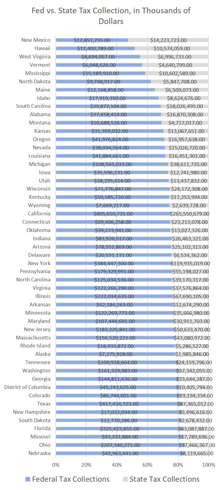 For example, in 2024, the Internal Revenue Service’s tax collections—including income tax, payroll taxes, and other lesser tax programs—collected a total of $5.1 trillion in taxes from Americans. State governments, on the other hand, collected $1.47 trillion during the same period. For every tax dollar extracted by state governments, the federal government demanded nearly three-and-a-half dollars. Even in high-tax states like California, the federal government is, by far, the level of government that collects the most taxes. In 2024, Californians overall paid more than $805 billion in taxes to the federal government. The California state government, on the other hand, collected $266 billion in taxes. Only in one state—New Mexico, where low incomes combine with relatively high taxes— does the state government collect more tax revenue than federal tax collectors. In every other state, residents pay more to the feds than to state revenue agents. In many states the difference is stark. In twelve states —including Nebraska, Ohio, Missouri, Florida, Colorado, and Texas—federal tax collections are about four times larger than the state tax collections. In Colorado for instance, residents paid out more than $86 billion in 2024 to the federal government. State taxes, however, amounted to less than $20 billion. The graph below shows the overall proportion of federal taxes as compared to the combined federal-state tax bill. In nearly every state, federal taxes account for more than 60 percent of the total bill.