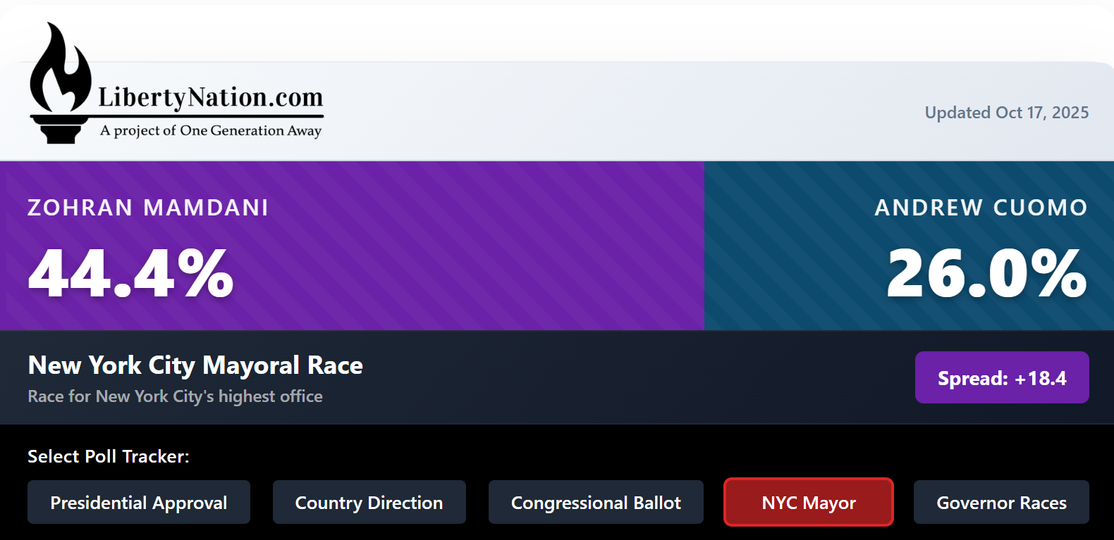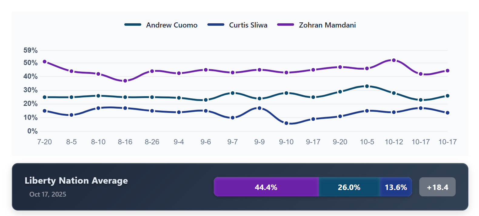 Mamdani’s polling lead appears insurmountable, currently averaging 44.4%, compared with former Governor Andrew Cuomo (running as an independent) at 26%, and Republican Curtis Sliwa with 13.6%. According to Liberty Nation News’ Public Square, that’s a survey lead of 18.4% for the young hopeful. However, the last candidate to win the mayoral contest with less than 50% of the vote was liberal Republican John Lindsay back in 1969.