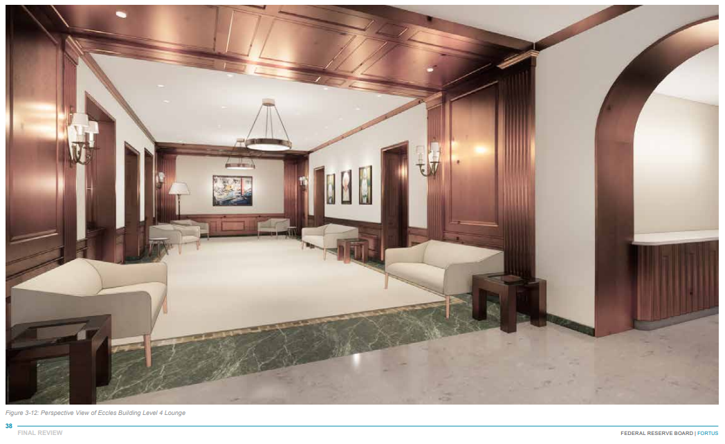 • A “Governors’ private elevator” to the executive dining suite (p. 37). Senator Tim Scott pressed Powell on these elevators, describing them as “new elevators that drop board members off at the VIP dining suite” and citing the page number. Powell responded that this is “just flatly misleading” and that “some of those are no longer in the plans,” referring to other things Scott listed, like rooftop terraces and ornate water features. Scott then asked if the plans changed because of the media attention, but then ran out of time, so Powell didn’t respond.