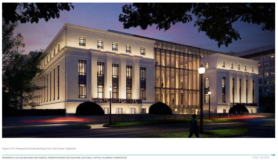 • An atrium VIP entrance, pictured below, with skylights in a “very a calm, almost ethereal square grid with large format glass,” with “twelve equal spaces in salute of the Federal Reserve’s branch banks. Each branch bank will be recognized with their name engraved in glass panels” (p. 34).
