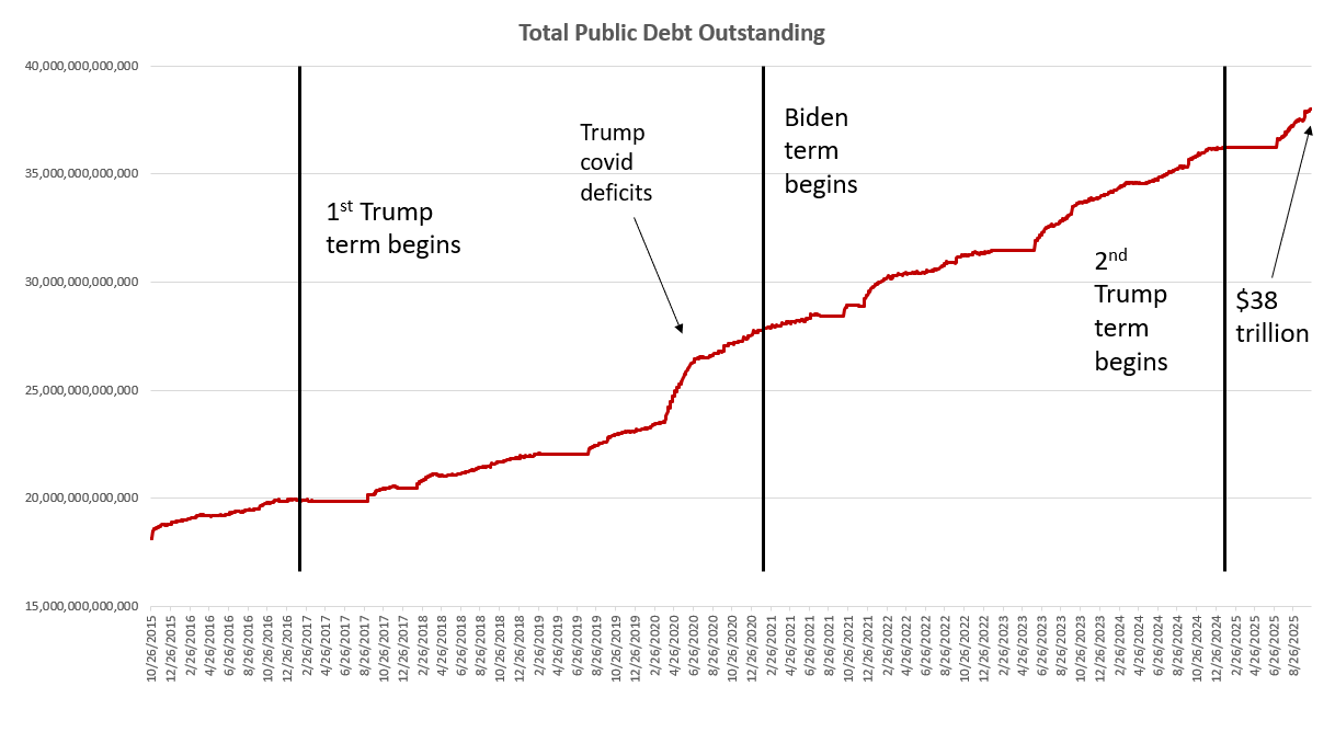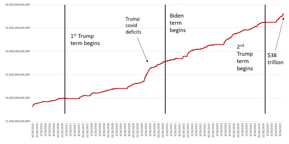 Last week, the US’s total federal debt surpassed $38 trillion. Federal debt now increases at a shocking rate, with the US’s debt increasing from $37 trillion to $38 trillion in just 73 days. It took nine months for the debt to increase from $36 to $37 trillion.