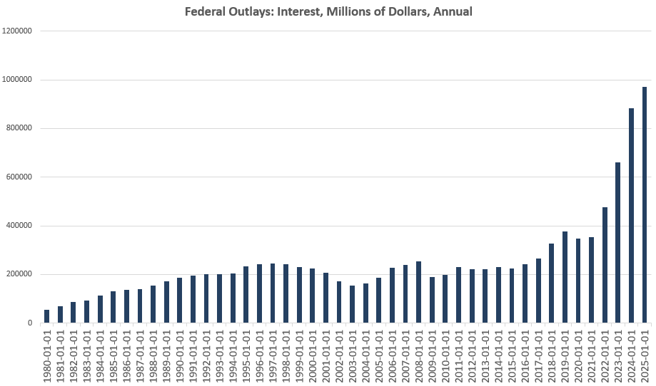 Looking at calendar years up through 2024, we find that interest paid on the debt has soared to new highs, and is now one of the largest areas of federal spending. 2024 was the last calendar year with interest spending under a trillion dollars. 2025’s interest payments will easily exceed $1 trillion, meaning the US now spends more on interest than on the military, and interest payments are exceeded only by the rapidly growing welfare programs like Social Security and government healthcare benefits. As interest rates continue to inch upward, this will become an even larger burden on taxpayers.