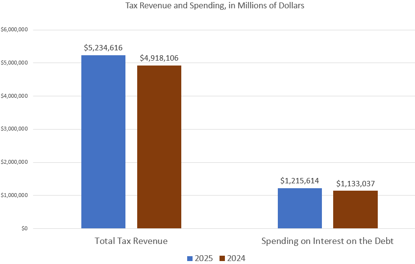 Rising debt payments for fiscal year 2025 continue an accelerating trend in interest costs. With FY 2025’s interest bill now topping $1.22 trillion, it’s up by 7.3 percent compared to the previous fiscal year.