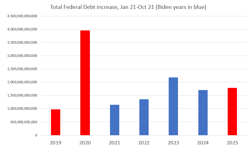 Since Donald Trump was sworn in for his second term, the national debt has increased by $1.78 trillion. This is one of the largest increases in debt we’ve seen during this period (Jan 21-Oct 21). During the same period of the previous year—under the Biden administration—the debt increased by $1.70 trillion. 2020, of course, remains unrivaled in the enormous amounts of debt added when the Trump White House pushed for inflating the money supply by trillions of dollars to “stimulate” the economy during covid lockdowns and rising unemployment.