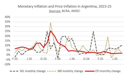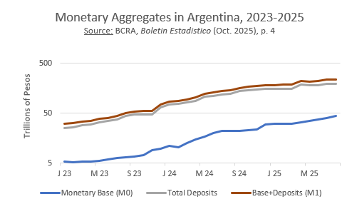 Furthermore, it not true that the previous government had increased the money supply “enormously” – if we understand this to be “much more than previous governments” or “much more than the Milei administration”. It certainly did not double, triple, or quadruple the money stock, as it is often the case in true hyperinflations. The actual evolution of the Argentinian M0 and M1 money aggregates (I could not find the data necessary to calculate M2) from January 2023 through August 2025 looks like this: