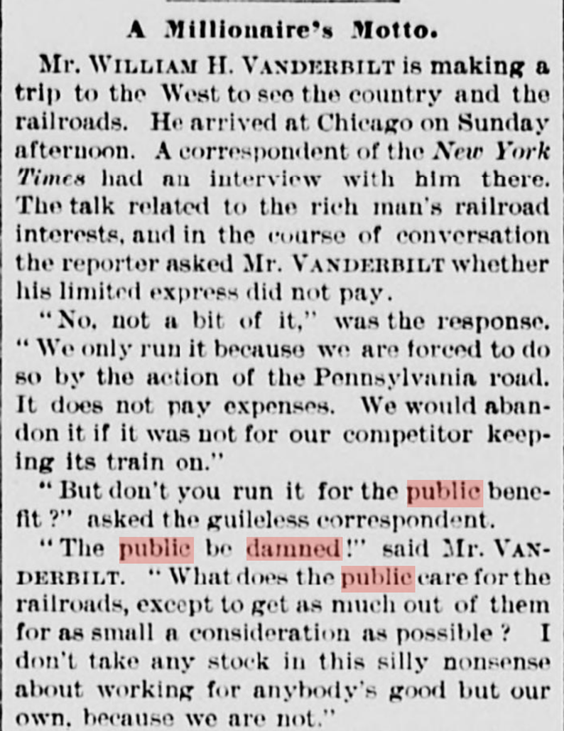 According to one account, William H. Vanderbilt said “the public be damned” during an interview with reporters aboard a Chicago-bound train on October 7, 1882. A reporter asked whether his limited express trains pay or were run for the accommodation of the public? “Accommodation of the public?” replied Vanderbilt, “The public be damned!”