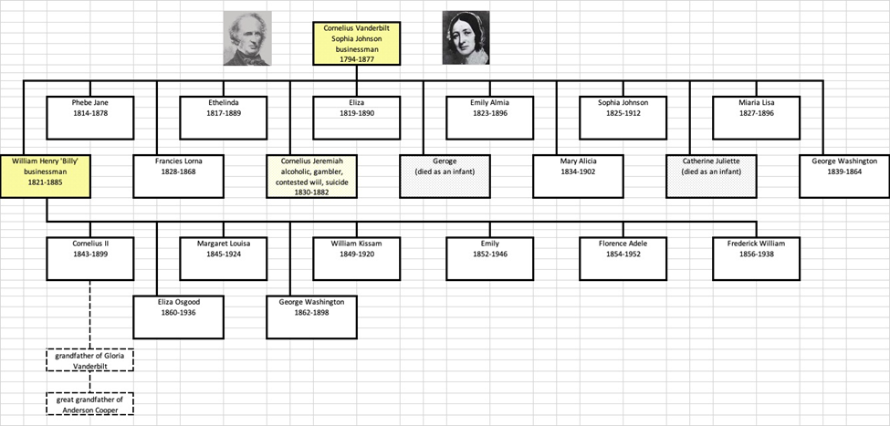 Of the Commodore’s two adult male children, one (in the dark yellow in the below chart) appeared to be cut from the same mold as he, and the other (light yellow), a wastrel. The Commodore left each of his surviving children a fortune; and, he left the overwhelming portion of his vast estate to William H., known within the family as “Billy.”