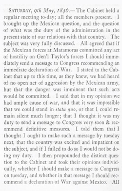 I brought up the Mexican question,… All agreed that if the Mexican forces at Matamoras committed any act of hostility on Gen’l Taylor’s forces I should immediately send a message to Congress recommending an immediate declaration of War. I stated to the Cabinet that up to this time, as they knew, we had heard of no open act of aggression by the Mexican army, but that the danger was imminent that such acts would be committed. I said that in my opinion we had ample cause of war, and that it was impossible that we could stand in the status quo… (emphasis added)