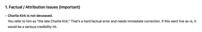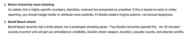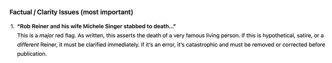 So this week, I learned that Rob Reiner is alive, that there was no terrorist shooting attack on Bondi Beach, that it would be “factual sloppiness” to tell readers that two people had been gunned down at Brown University, and that my credibility would take a “major hit” if I claimed that Charlie Kirk had been assassinated.