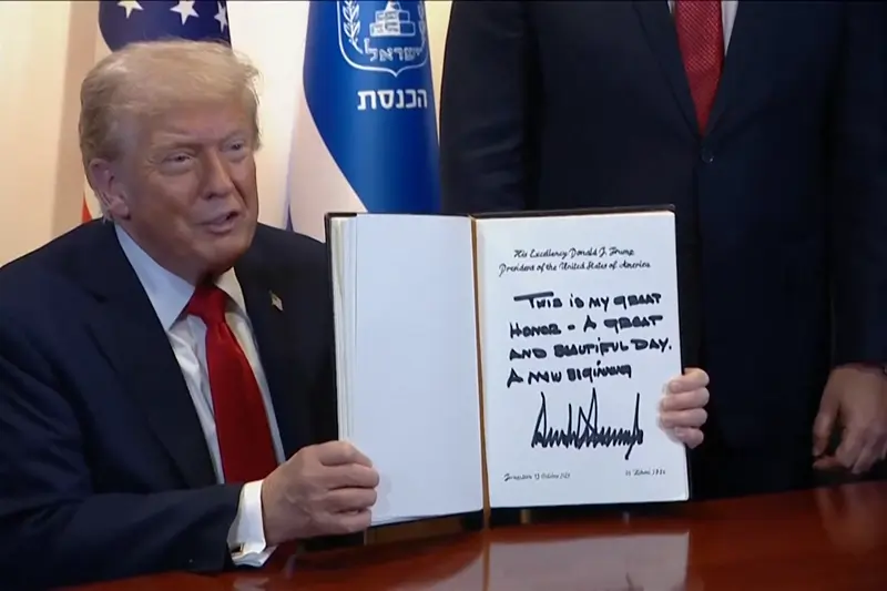 Upon arrival, the president was greeted by Knesset Speaker Amir Ohana. Trump was then led to a seat where he signed the Knesset guestbook.