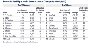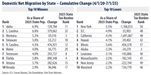 First Trust, an investment firm whose chief economist is supply-sider Brian Wesbury, did its own analysis, looking at percentage change rather than absolute numbers, and also listing Tax Foundation data on tax burden. “Where 1 is the least tax-burdened state and 50 is the most tax-burdened state, the top 10 domestic migration winners boasted an average tax burden ranking of 18. In contrast, the top 10 domestic migration losers exhibited an average tax burden ranking of 39,” First Trust said.